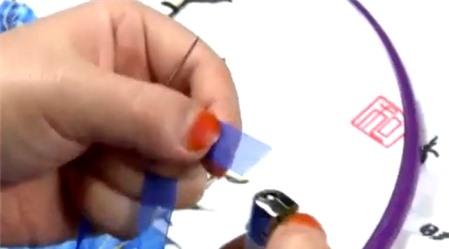 Bạn xoắn ruy băng vào kim theo chiều từ trái sang phải để tạo thành một vòng thắt nút rồi đâm xuống bên dưới (chỗ đầu hình bầu dục)