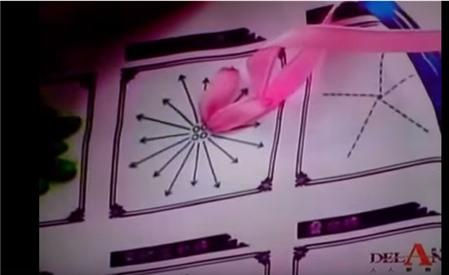 Với mẫu có hình vẽ mũi tên này, bạn thêu theo kiểu sau: Lấy kim chọc vào phần tâm của bông hoa, kéo ruy băng lên cho độ phồng vừa phải, sau đó, chọc kim ngược lại vào phần ruy băng và căn cho đúng chỗ mũi tên.