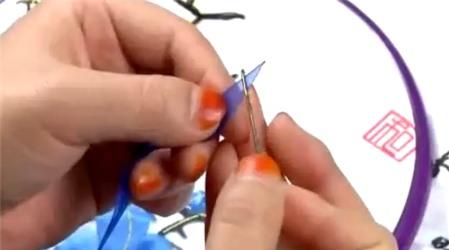 Đầu tiên, để thực hiện theo hướng dẫn thêu tranh ruy băng bạn xâu kim vào phần ruy băng vát chéo