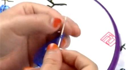 Thực hiện thêu cành cây, bạn đâm kim từ phần cành cây ra, sau đó đâm vào phần ngọn cành cây đó, trước khi đâm, hãy dùng tay xoắn ruy băng lại như trong hình
