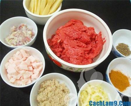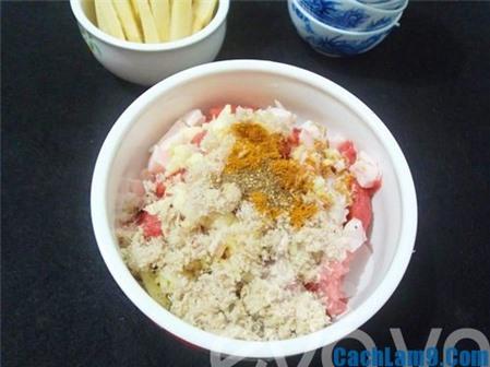 vào bát to, thêm mỡ heo thái hạt lựu, hành, tỏi và sả băm nhỏ, đường, ngũ vị hương, hạt tiêu rồi dùng đũa trộn đều các nguyên liệu với nhau.