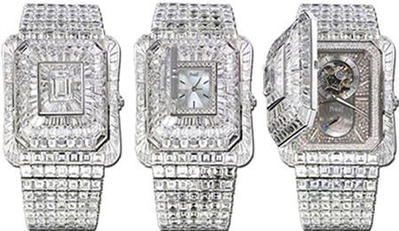 Chiếc đồng hồ này đắt tiền đến nỗi thậm chí không có một mức giá niêm yết cố định, nhưng được dự đoán vào khoảng 26 triệu USD. Đây là chiếc đồng hồ đắt nhất tính đến thời điểm này. Bạn sẽ thắc mắc tại sao nó đắt như vậy? Nó được tạo thành bởi một dây các viên kim cương vuông và đá quý lấp lánh kết hợp với nhau cộng thêm nút chỉnh bằng bạc gắn sapphire.