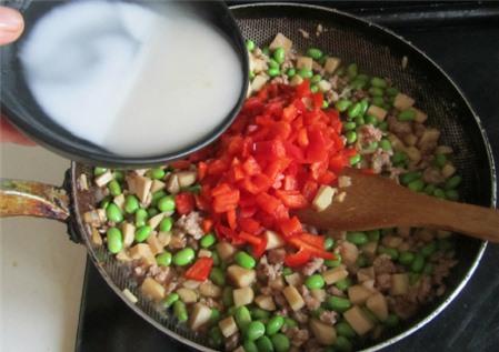 Đến khi đậu và nấm gần chín thì bạn thêm ớt chuông và bột ngô pha cùng chút nước lọc vào đảo đều.