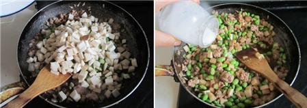 Khi thấy thịt bắt đầu chuyển màu thì cho nước tương nhạt cùng dầu hào vào xào khoảng 2-3 phút để thịt thấm gia vị thì thêm đậu Hà Lan và nấm bào ngư vào chảo, nêm thêm ít muối và tiêu xay.