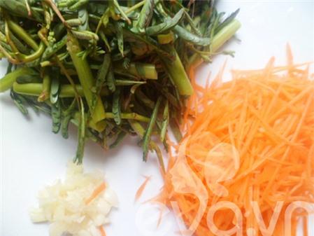 Bước 2: Rau rút nhặt bỏ phần xốp trắng, lấy phần lá, ngọn và phần thân non bẻ thành từng đoạn dài 3- 4cm. Cà rốt gọt vỏ, bào sợi. Tỏi băm nhỏ.