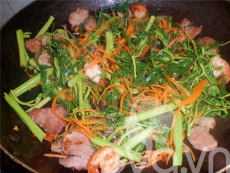 Bước 6: Xào chín thịt, cho rau rút và cà rốt vào xào. Đảo nhanh tay trong vòng 1 phút, bỏ thêm chút hạt nêm vào cho vừa miệng, tắt bếp.