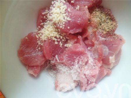 Bước 3: Thịt thái thành từng miếng nhỏ vừa ăn, ướp thịt cùng với một chút gia vị, hạt nêm và hạt tiêu