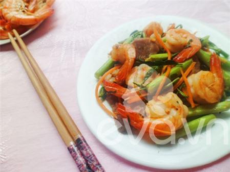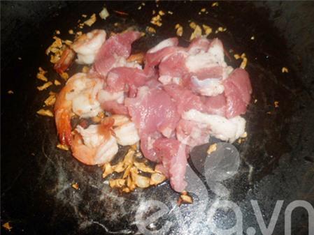 Bước 5: Phi thơm tỏi, cho tôm vào xào chín. Tiếp đến cho thịt vào xào cùng.