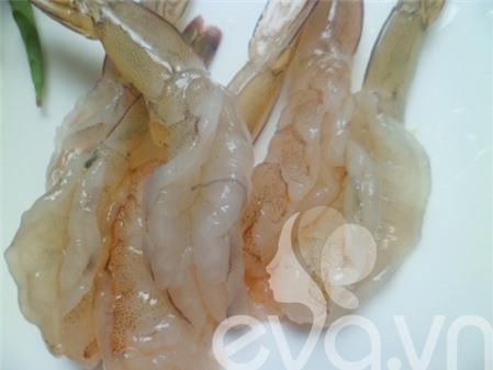 , bỏ đầu, dùng dao khứa dọc theo lưng tôm lấy chỉ đen. Ướp tôm với một chút xíu hạt nêm.